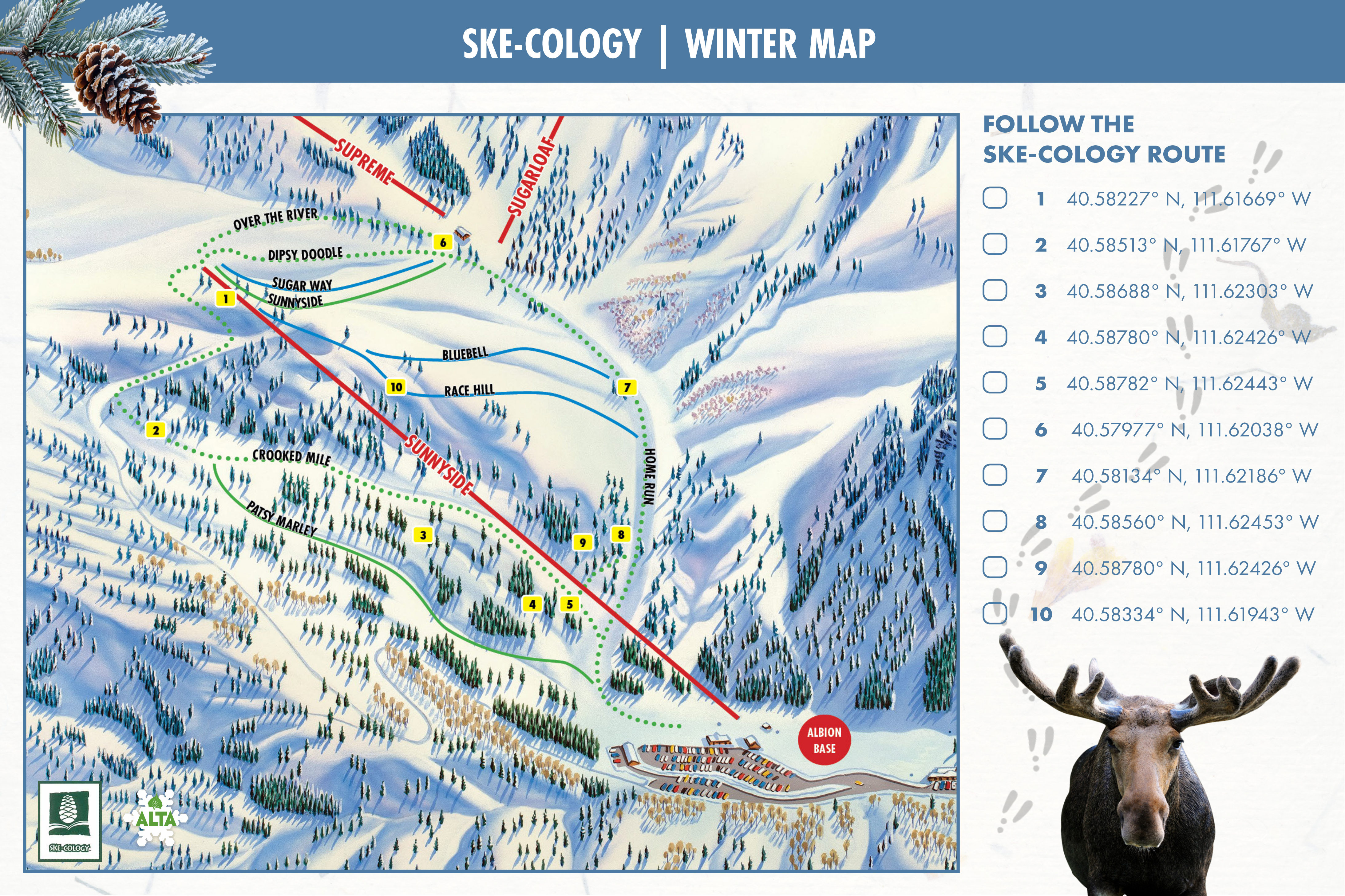 Alta has transformed the great outdoors into our classroom with ten interpretive signs hidden throughout the slopes of Sunnyside. Each sign reveals fascinating facts about Alta’s ecology, geology, wildlife, history and more! SKE-COLOGY is a self-guided scavenger hunt that allows you to explore Alta while discovering what makes the mountain unique. This program began in the 1990s as a collaboration between the U.S. Forest Service, Vail Mountain Resort and Alta Ski Area and was initially designed for ski school groups and beginner skiers. Over the years, it has evolved into a year-round educational experience for skiers and hikers of all ages and skill levels.