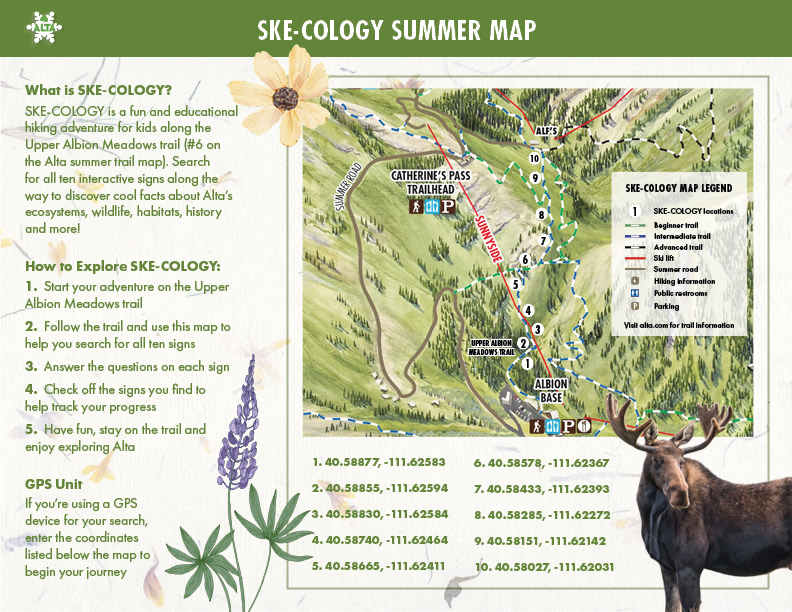 SKE-COLOGY began in the 1990s through a partnership between the US Forest Service and Vail Mountain Resort, piloted at Alta Ski Area. Initially designed for ski school groups and beginners, it has grown into a year-round educational experience for skiers and hikers of all ages and abilities. With the addition of summer hiking trails, you can now explore Alta year-round and discover what makes this mountain environment so special.